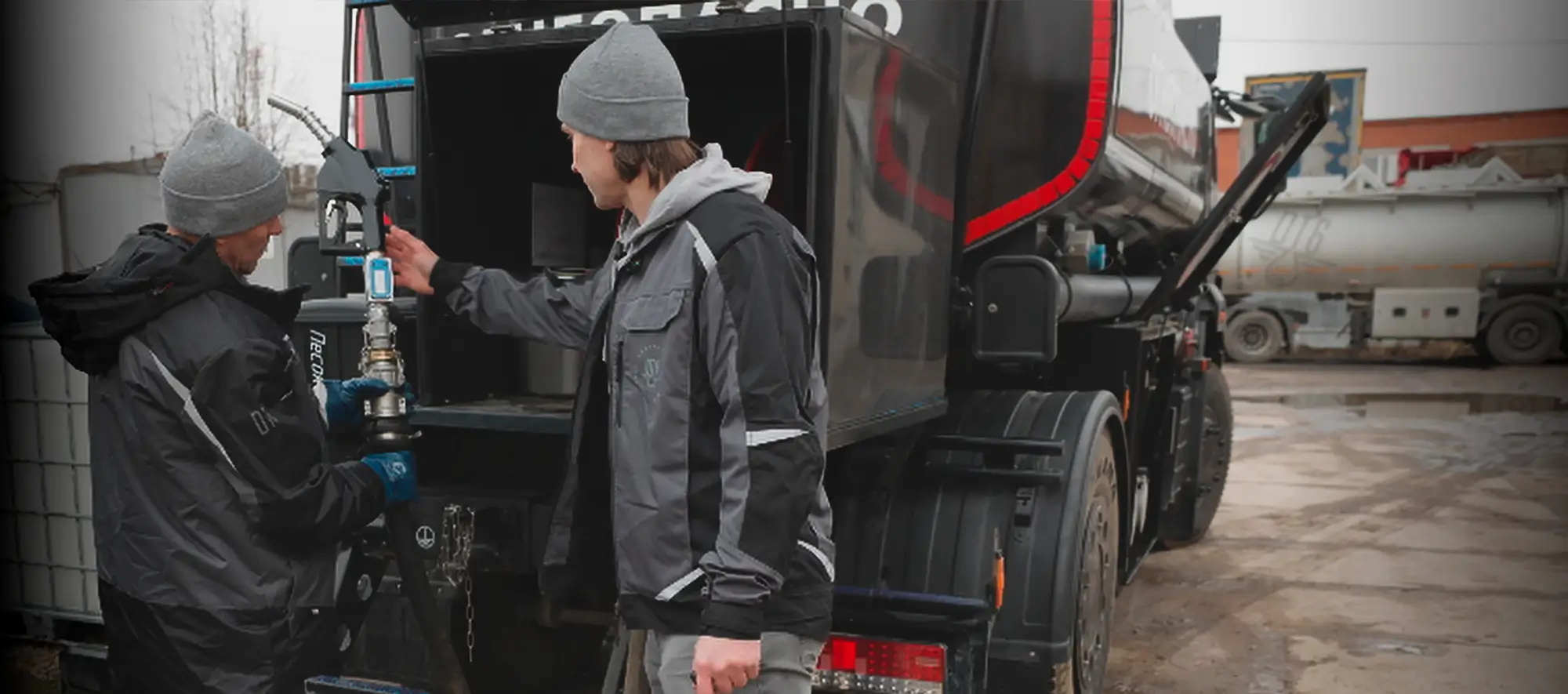 - Водитель бензовоза разматывает свой шланг.
