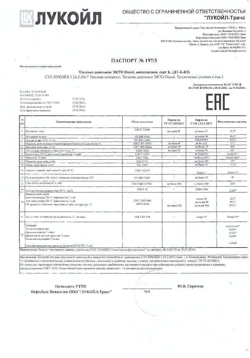 - Высоким экологическим классом К5: дизтопливо соответствует современным нормативам Евро-5 благодаря низкому содержанию серы 8.8 мг/кг.